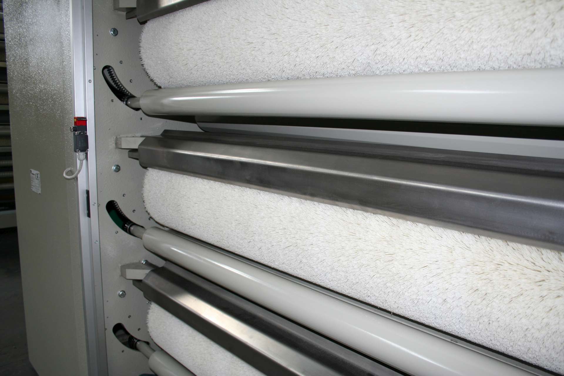 – 6 ABRASIVE BRUSHES in SILICON CARBIDE (carbon), CERAMIC, or other abrasive means, independently controlled by AC motors with inverters; – 6 APPROACHING ROLLERS that are setting independently the contact of the fabric with the brush, thanks to an innovative approaching system that keeps a constant distance between the brush and the approaching roller.