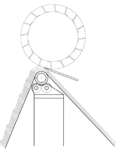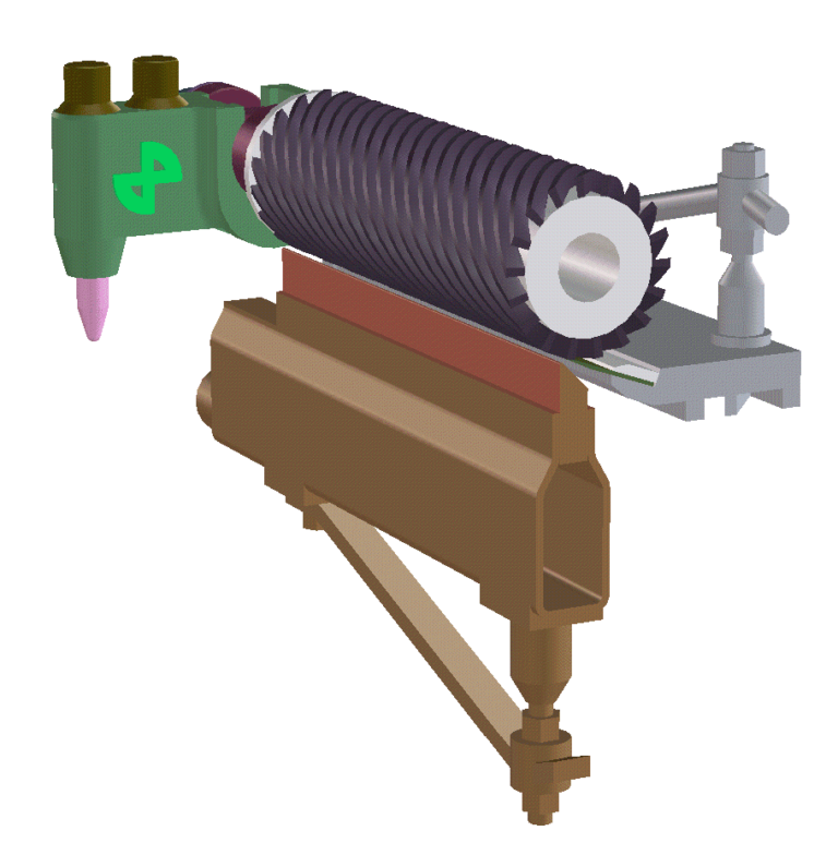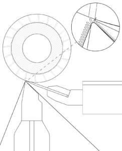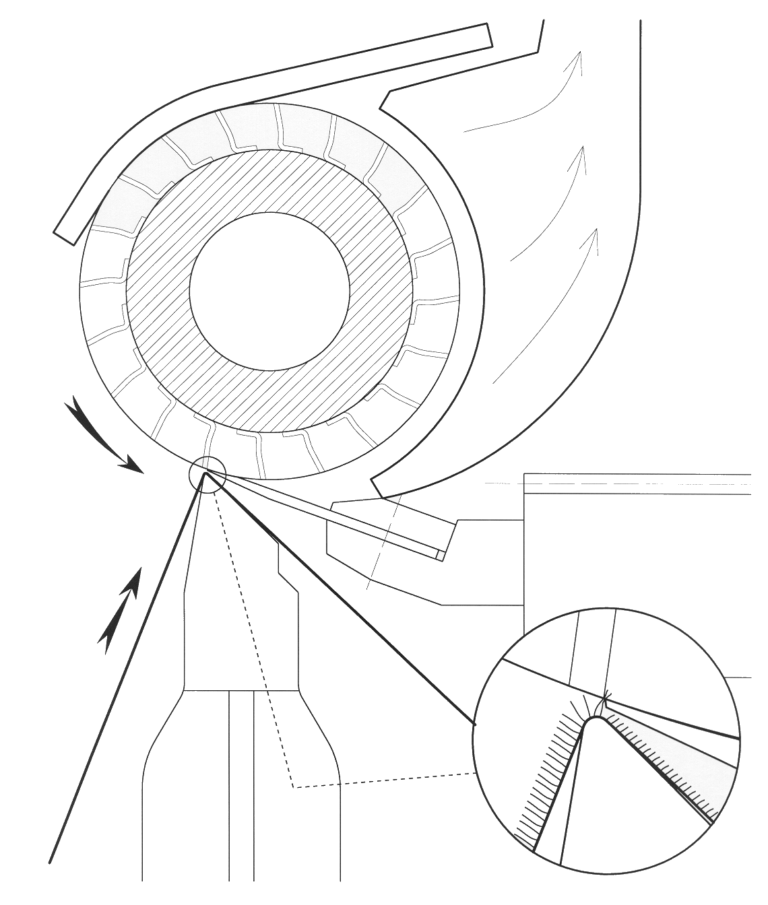 The rotation of the shearing roller on the flat blade, creates a continuous cutting effect and the point where the flat blade and the helical blades meet, is called the cutting point.